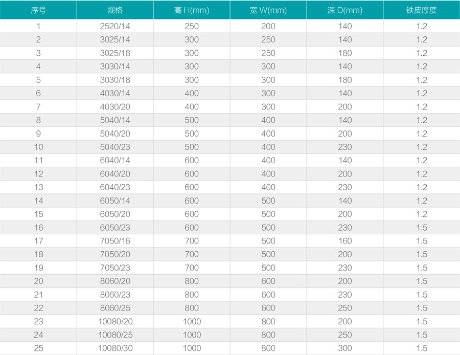 JXF分为外露式和隐蔽式两种,JFF分为金属门和透视窗门。门板上贴有密封胶条,防止雨水渗入。箱体上设有上、下进、出水孔和安装底板。进出口孔在出厂时已安装密封板,门扇开启角度大于90度。JXF、JFF有25种规格,JFF2有18种规格(5040/14以上起)。